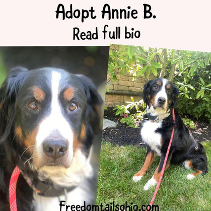 Adopt Annie. Annie is a 7 year old Bernese Mountain dog who was adopted then returned to FTO as her owners felt she did not adjust well to their home. She is a cautious and timid Berner who came back to the rescue with a great deal of anxiety and constant digestive problems. Since her return, Annie has come along way with her social anxiety. She now takes long walks, no longer afraid of people walking by, bikes, or cars. She continues to startle to loud sounds or unexpected movements. Annie seeks attention, loves hugs and pets, comes when called and no longer hides in her crate as long as she is in a familiar environment with familiar people. She does well with other dogs as they so provide her comfort. House training is a struggle for Annie due to her continuous digestive problems.